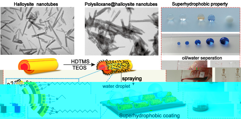 超疏水材料具有自清潔、抗粘附、油水分離等多種優異特性,典型的人工超疏水材料制備方法是使在具有微米尺度的粗糙材料表面上構造納米結構。然而,現在文獻上所用的多數疏水材料價格昂貴,疏水塗層的制備工藝重現性差,疏水微納米結構在受到外力摩擦時極易受損。這些問題制約了超疏水塗層的規模化應用。針對這些問題,該論文作者提出了利用自然界中存在的天然納米管狀礦物材料,通過疏水改性進而用噴槍噴塗到基底上形成高性能超疏水塗層的制備策略。該納米材料首先經十六烷基三乙氧基矽烷和正矽酸乙酯共聚合表面疏水化改性,進而分散到甲苯中配成疏水塗料。疏水塗料經過簡單的噴塗工藝,可以實現在玻璃、紙張、紡織物、木材、金屬等多種表面獲得優異的疏水效果。有趣的是,将這些疏水塗層噴塗到尼龍網上,可以實現對油水混合物的高效分離。該工作的意義在于拓寬了埃洛石粘土礦物的應用領域,制備出了低成本高性能的疏水塗料,有望在防水材料、自清潔塗層和油水分離材料上獲得實際應用。