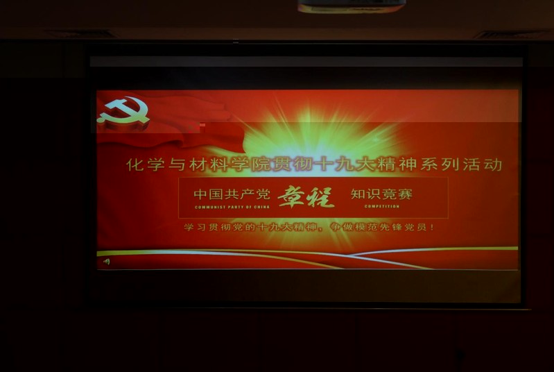 主持人宣讀黨章知識競賽的比賽規則,正式開始了比賽。參賽隊伍有5支:化學系本科生黨支部、材料科學與工程系本科生黨支部、化學系研究生第二黨支部、材料科學與工程系研究生黨支部、化學系研究生第一黨支部。