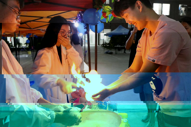 “啊!不會燙到嗎?”在“徒手玩火”攤位,一位兄弟學院同學感歎化學實驗的神奇:“我的天,居然還可以這樣!”,當親眼目睹火焰從掌中冒出,而手卻毫發無損,很多同學都被這一幕震撼,紛紛參與到實驗當中。除了“徒手玩火”外,現場還有很多有趣的實驗,如,在火焰的烘烤下讓白紙顯現出圖案的“蔥汁寫密信”、自發變大而一戳就破的“幹冰水晶凍”、一滴牛奶加一點洗潔精即可出現多種變化的實驗、光芒耀眼的鋁熱反應……