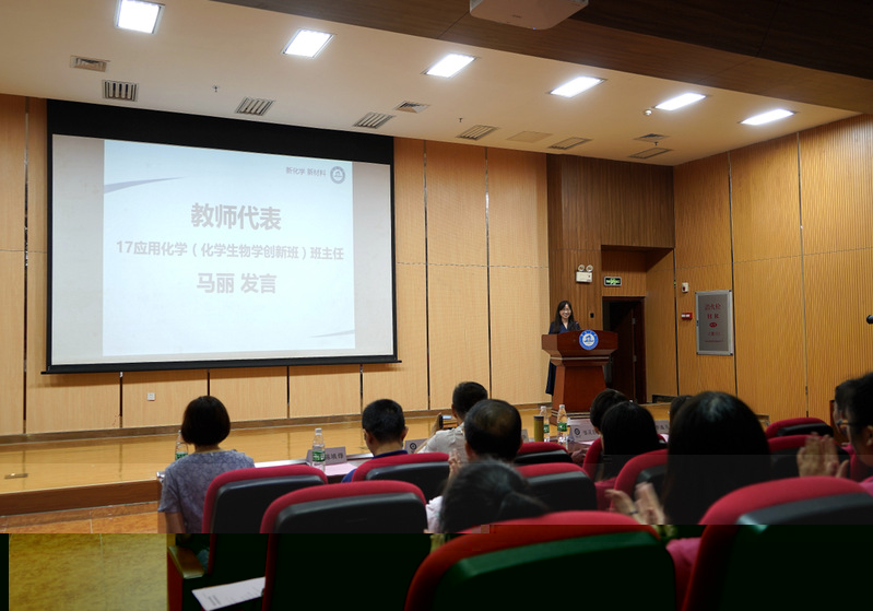 緊接着,化材院副研究員、2017級應用化學(創新班)班主任、2016年香港科學會“青年科學家候選人”馬麗老師上台發言,她以“金秋送爽,丹桂飄香”開篇,回憶起自己從本科到博士的成長曆程,叮囑同學們繼續發揚高中時期枕戈待旦的拼搏精神,不要浪費青春,要認準目标、謹慎選擇,努力在大學學會守忠義、講道德,學會尊重、學會做人。
