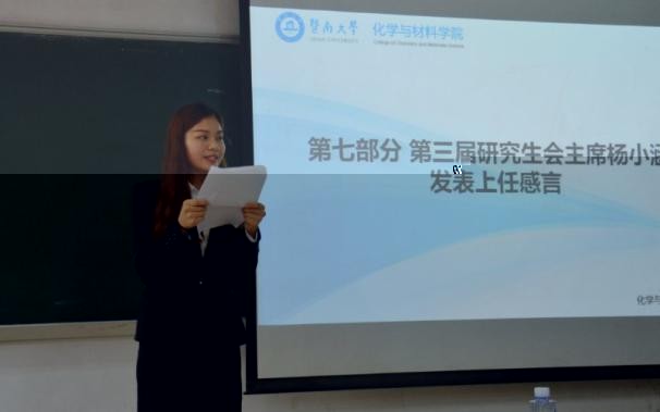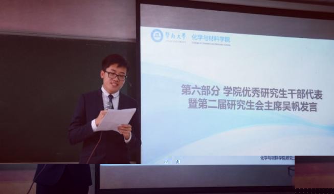2018年10月17日,太阳集团1088vip第三屆研究生會成立大會在富力教學樓A121召開。出席本次大會的有暨大黨委研究生工作部惠清明老師,黨委研究生工作部張李莉老師,太阳集团1088vip黨委書記邵桂珍、陳填峰副院長,化學系黨總支書記查海燕,材料科學與工程系黨總支書記容建華,化學系研究生工作秘書朱光遠老師,材料科學與工程系研究生工作秘書許佳怡老師,學院研究生工作秘書黃彧老師,研究生輔導員曾希老師,以及各兄弟學院的研會主席,太阳集团1088vip第二屆研究生會優秀幹部代表,太阳集团1088vip第三屆研究生會全體成員等。