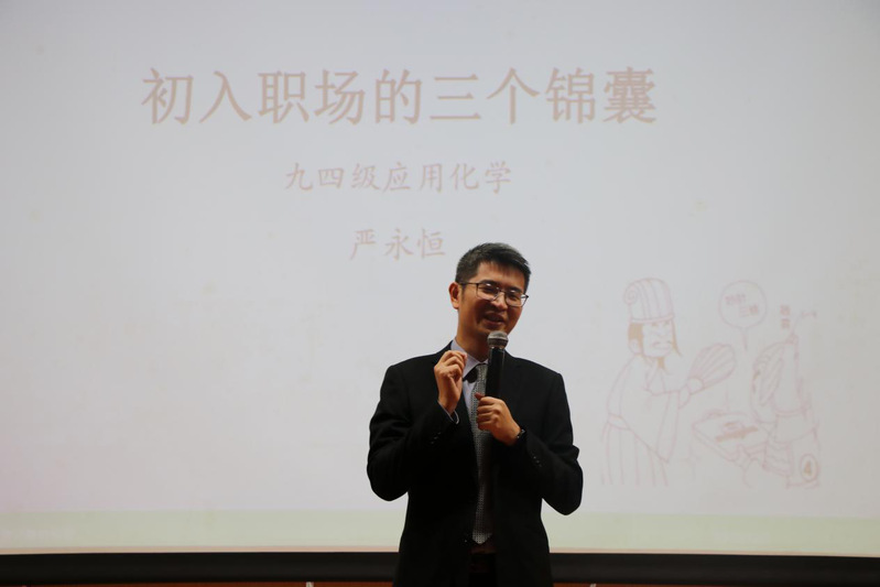 最後一位分享幹貨的師兄是94級校友嚴永恒先生。嚴師兄畢業以後先後在國企和港資企業從事銷售工作,後轉至全球最大的不幹膠企業,從基層銷售員一直做到大區銷售總監,之後創立自己的标簽材料公司,現在依然在各個方面不斷創新發展。嚴師兄同樣為我們帶來了初入職場的經驗分享。他滿懷激情地分享了“初入職場的三個錦囊——理想和信仰,堅持,包容和開放的心态”。最後,師兄激勵我們,“你的心胸有多寬廣,你的事業就有多偉大”!