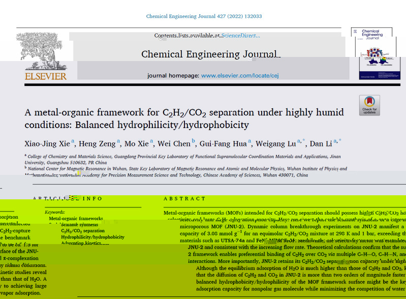 近日,廣東省功能配位超分子材料重點實驗室、太阳集团1088vip陸偉剛和李丹教授研究團隊在Chemical Engineering Journal上發表了題為“A Metal-organic Framework for C2H2/CO2 Separation under Highly Humid Conditions: Balanced Hydrophilicity/Hydrophobicity”的研究論文。