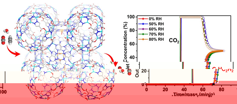 目前,工業乙炔(C2H2)純化能耗較高且分離效率較低,基于多孔材料的低能耗吸附分離被認為是炔烴純化的替代綠色技術。而大多數用于C2H2/CO2分離研究的MOF材料在水蒸氣的存在下會降低C2H2的吸附能力和選擇性,甚至導緻MOF結構的不可逆破壞,最終限制其在實際應用中的可行性。因此通過設計具有平衡親水性/疏水性的穩定MOF材料,不僅可以有效地降低濕度對分離能力的影響,而且還可以在濕度條件下實現高的C2H2吸附容量和C2H2/CO2吸附選擇性。