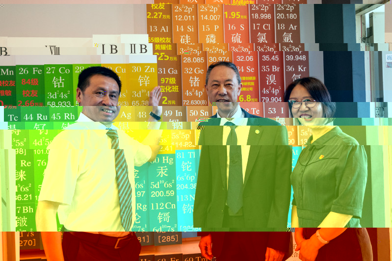 (林如鵬書記見證學院為梁仲景、黃耀佳兩位名譽會長贈送化學樓水晶模型)