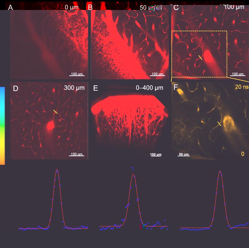 圖2 (A-D)小鼠腦血管在不用深度下的雙光子成像圖片;(E)在0-400微米深度成像圖片所構建的3D圖;(F)腦血管在100微米深度的雙光子激發熒光壽命成像圖;(G-I)在(C、D和F)圖中沿着血管所畫直線上獲得的熒光強度及所推演的血管直徑和成像信噪比。