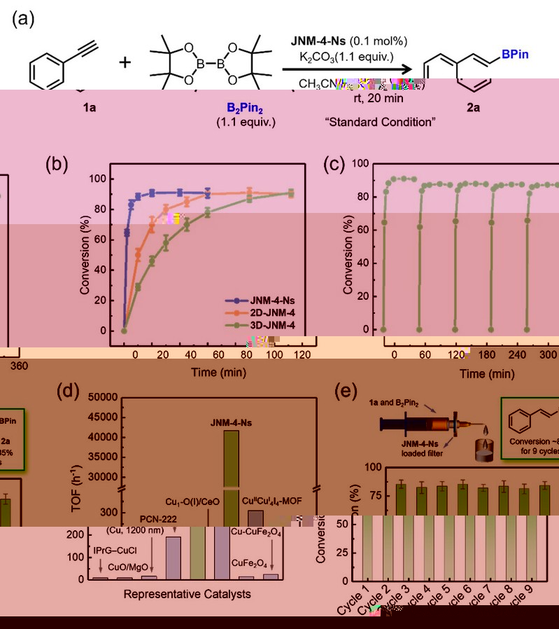 圖3. (a) JNM-4-Ns催化苯乙炔的硼氫化反應;(b) JNM-4-Ns、2D-JNM-4和3D-JNM-4的轉化率與反應時間的關系圖。(c) JNM-4-Ns催化劑的可循環性。(d) JNM-4-Ns的TOF與文獻中用于苯乙炔硼氫化反應的催化劑比較。(e) 基于JNM-4-Ns的流動反應器示意圖(上)和其對苯乙炔硼氫化反應的優異催化效果(下)。