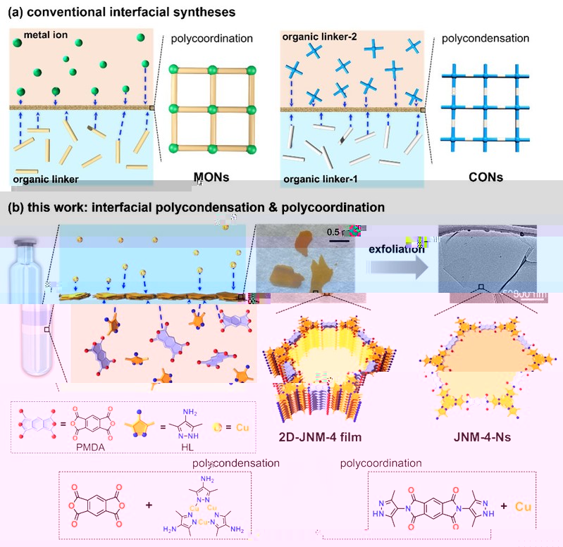 圖2. (a) 構建MOF/COF納米片或薄膜的常規界面合成法;(b) 本研究提出的基于三種活性單體和兩種聚合反應(即縮聚反應和配位聚合反應)的新型界面合成方法。