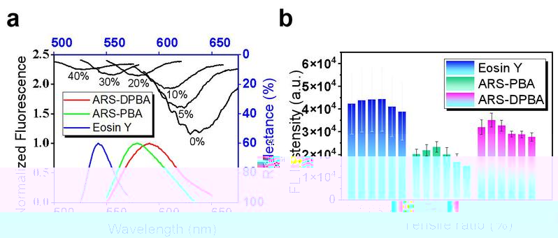 選取茜素紅S-2-氨基乙基聯苯基硼酸酯(ARS-DPBA)、茜素紅S-苯硼酸(ARS-PBA)和曙紅Y三種熒光指示劑負載于PC膜上研究其彈性熒光增強特性,發現,熒光強度的差異性變化是由熒光染料的發射峰與光子禁帶的重合程度(慢光子效應)以及光子晶體反射率随拉伸率增大而下降的共同作用結果。光子晶體膜能夠在不同拉伸率下差異性地改變不同熒光染料的熒光強度,為高效的多光譜分析提供了豐富的傳感信息。(如圖3)