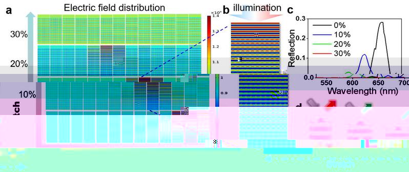圖2. 有限元分析(FEA):(a)光子晶體膜在不同波長光照射下拉伸過程中的電場分布的有限元分析;(b)在606 nm光照下,10%拉伸PC膜内的電場分布;(c)不同拉伸率PC膜的有限元模拟光譜;(d) 拉伸過程中PC膜的變形機制。