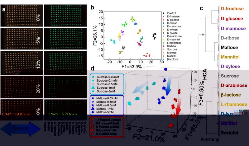 圖4. 可拉伸PC芯片用于各種糖類的鑒别 (a) ARS-DPBA斑點PC芯片對14種糖類的熒光響應。拉伸率的變化引起熒光信号的多樣性。 (b) 14種糖類的LDA鑒别結果。(c) 14種糖類的HCA分析的樹狀圖; (d) 梯度濃度下三種糖的得分圖,沿箭頭方向濃度增大。