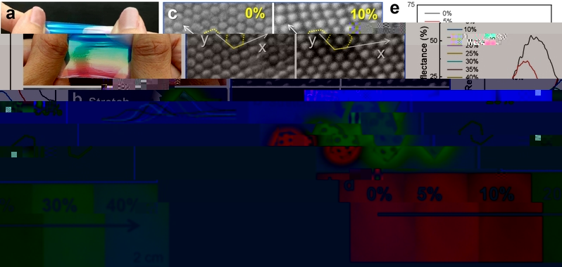 圖1. 可拉伸光子晶體膜——結構色和彈性光學特性:(a)受力不均勻時柔性PC膜的多彩結構色;(b) 可拉伸PC膜的納米結構-顔色對應示意圖;(c)不同拉伸率(εx)下PC膜的SEM圖;(d) εx從0到5%,10%,20%,30%,40%的PC膜在白光照射下的光學照片;(e) 拉伸過程中PC膜的反射光譜;(f) 不同拉伸率下光子晶體膜的反射峰位置。
