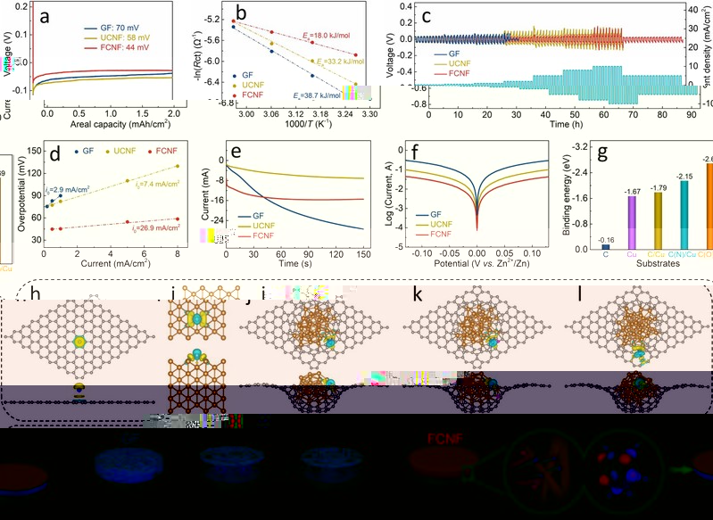 鑒于此,本工作通過在低厚高強纖維素納米纖維膜(CNF)基底表面設計MOF衍生的C/Cu納米複合修飾層實現了厚度僅23 µm且具有優異鋅負極穩定能力的功能性超薄隔膜(FCNF)。CNF膜基底的納米孔結構、超低厚度和離子篩分功能有利于鋅離子快速而均勻的傳輸,而高比表面積C/Cu納米複合修飾層的鋅親和能力(特别是含雜原子C/Cu界面顯示出高度親鋅特性)為鋅沉積提供豐富低勢壘形核位點、改善鋅沉積動力學,二者協同調控鋅沉積界面化學,從而實現鋅負極穩定和超薄隔膜的持久耐用。本研究不僅為穩定鋅負極提供了新的策略,同時為水系鋅離子電池超薄隔膜的設計提供了理論借鑒。