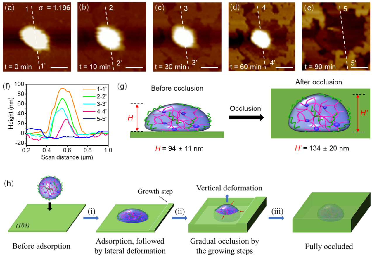 該工作巧妙地設計了一系列柔軟度可調的高分子凝膠顆粒,利用該凝膠顆粒與礦物晶體之間的相互作用,實現了凝膠顆粒在礦物晶體中的變形取向内嵌。該工作突破了納米顆粒從簡單的無序内嵌到有序的自取向内嵌,為構建具有複雜多級結構的新型高分子-無機晶态複合材料提供了一種嶄新的仿生策略。值得指出的是,該工作利用原位原子力顯微鏡實時監測了納米凝膠粒子内嵌方解石的全過程,揭示了納米凝膠顆粒變形取向内嵌的機理(圖2a-f),深化了人們對生物礦物形成機制的認識。