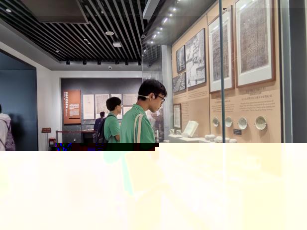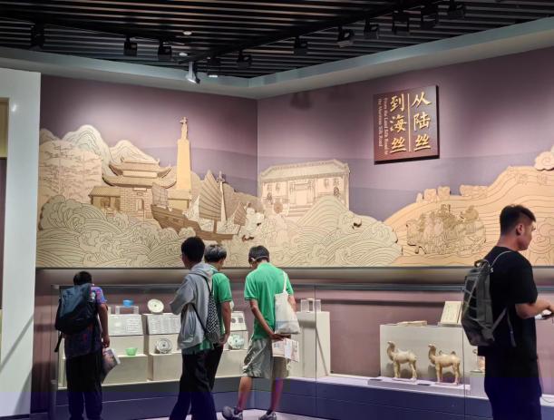 跟着博物館的展覽順序,同學們首先來到“七海揚帆”展廳。展覽從中外航線、造船航海、港口城市、瓷器出口、香藥進口、南海神廟國家禮制、市舶制度、佛教海路傳播以及蕃商蕃坊等方面,多角度展示了唐宋時期廣州海上絲綢之路曆史風貌,再現了千年前廣州城市繁榮、商業興盛和文化交融的曆史盛況,讓同學們學習到廣州對外交流的曆史,感受到航海文化的魅力。在“西出陽關”展廳,師生們則學習了解了先秦至宋元時期新疆精美的絲綢毛紡織品、珍貴的多民族語言文字的簡牍文書、美輪美免的雕塑壁畫、奢華的金銀珠寶、彩陶、青銅等國家寶藏。一件件文物,訴說着絲路上的動人故事。展覽以雄渾壯闊的西域場景氛圍,讓師生們能夠身臨其境地感受絲綢之路的繁盛景象。