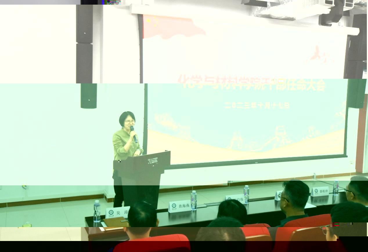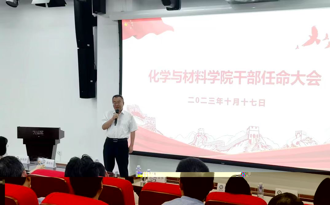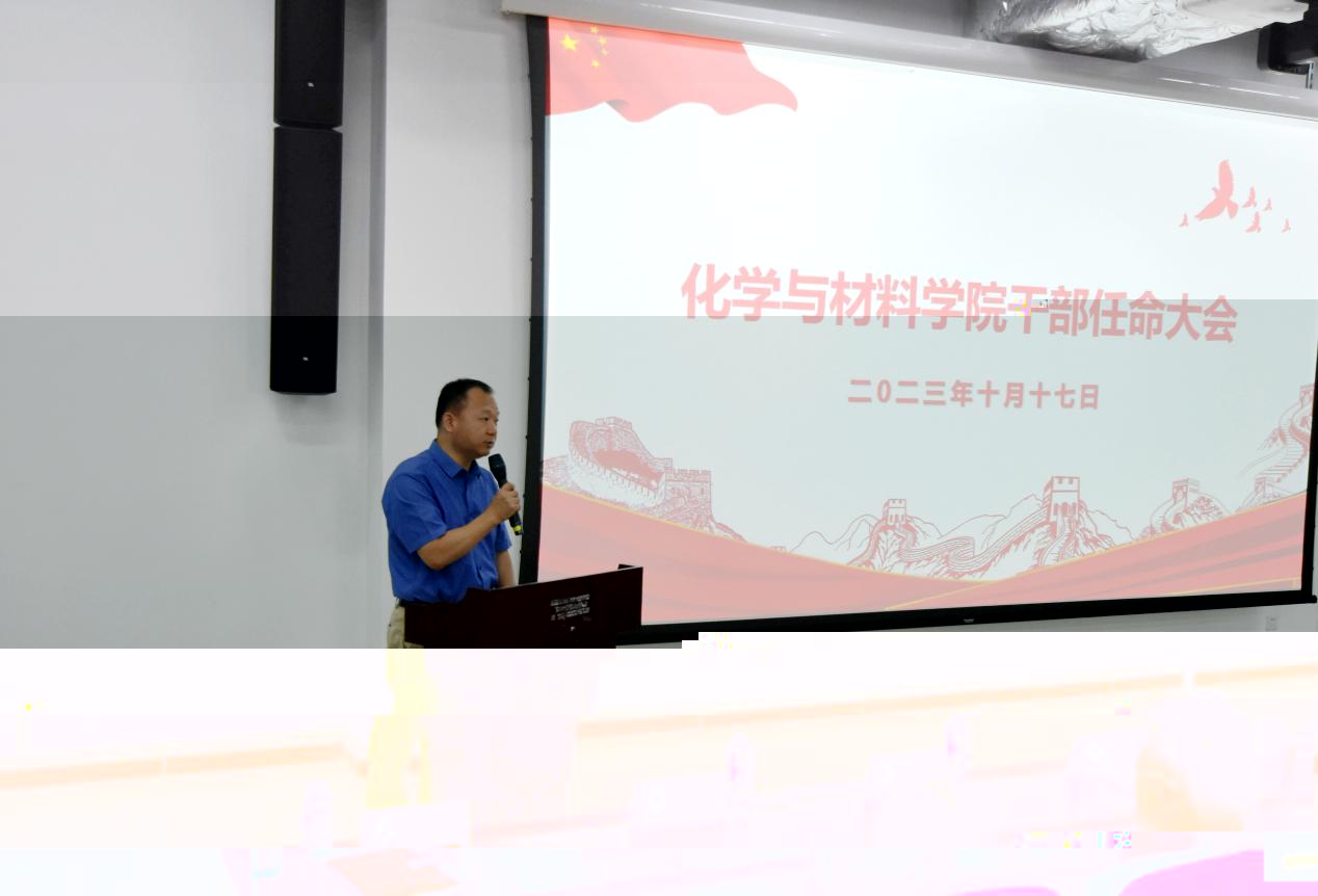 陳龍代表學校黨委組織部宣讀幹部任命文件,經學校黨委常委會研究決定,任命陳填烽同志為化學與材料學院院長,吳濤同志為化學與材料學院黨委書記;因年齡關系,李丹同志不再擔任太阳集团1088vip院長,邵桂珍同志不再擔任太阳集团1088vip黨委書記。