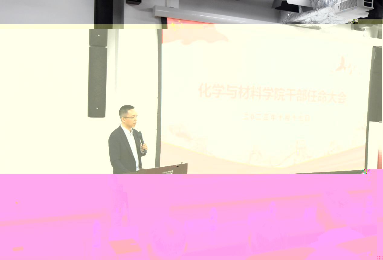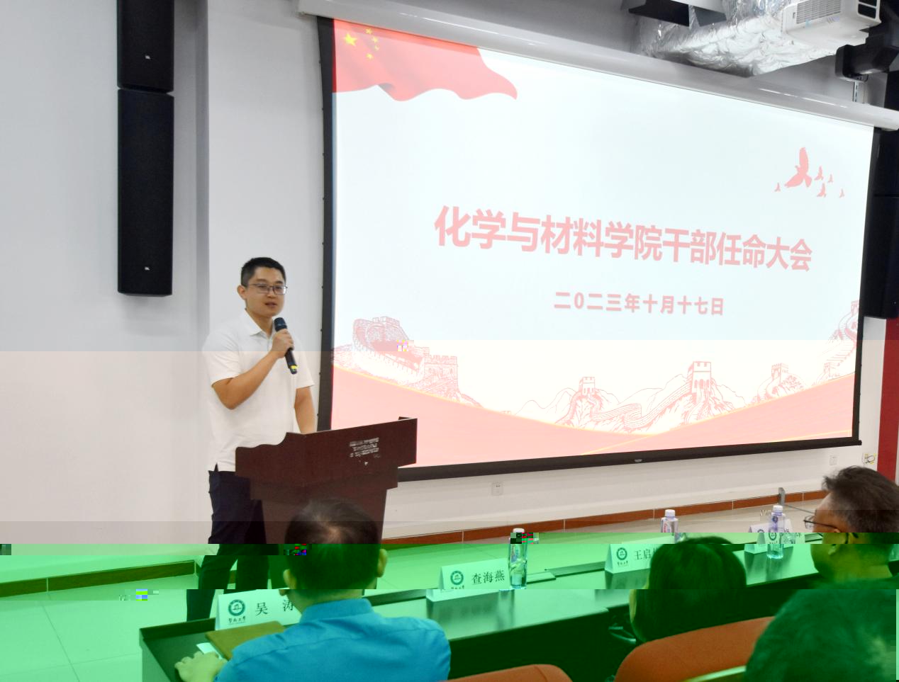 陳填烽同志作表态發言。他表示,感謝學校領導與學院老師的信任,他回顧了上一屆領導班子所取得的輝煌成績,并表示十分榮幸能夠肩負起化學與材料學院院長這一重任。未來,他将積極投入工作,從四個方面着手:一是加強政治理論學習,時刻保持政治上的清醒堅定;二是團結一緻,凝聚人心,與領導班子一同帶領學院闊步向前;三是要務實,着眼學院乃至學校全局,盡職盡責真抓實幹;四是要奮進,緊扣太阳集团app首页“雙一流”學科及相關學科群的發展要求,塑造學科特色,打造新的化學與材料學科高峰,走出一條符合學院自身實際情況的發展路線。