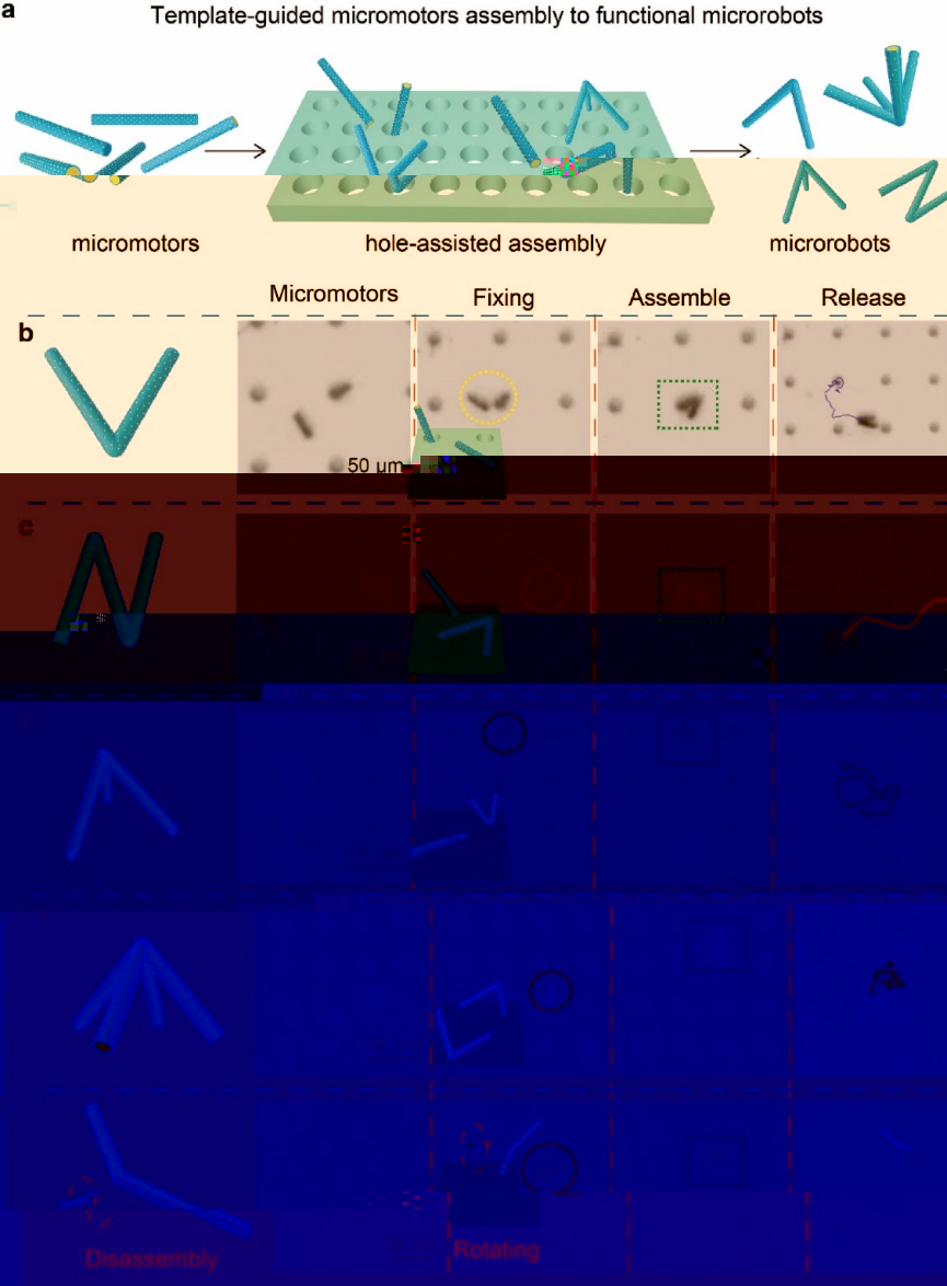 正如在宏觀機器構造一樣,設計功能強大的微納機器人也需要可控組裝作為一種高效策略。研究團隊利用所開發的MIS結複合馬達的磁性特征,創新性的提出了一種微洞陣列模闆輔助組裝(HAA)的方法,如圖4所示,首先将一個馬達引導進入洞中固定,然後操控另一個馬達與其組裝,重複該過程即可實現不同結構微機器人的構建。除了組裝,通過微洞還可實現解組裝的操作。孔輔助組裝為微納機器人的構建提供了一種簡單可行的策略。