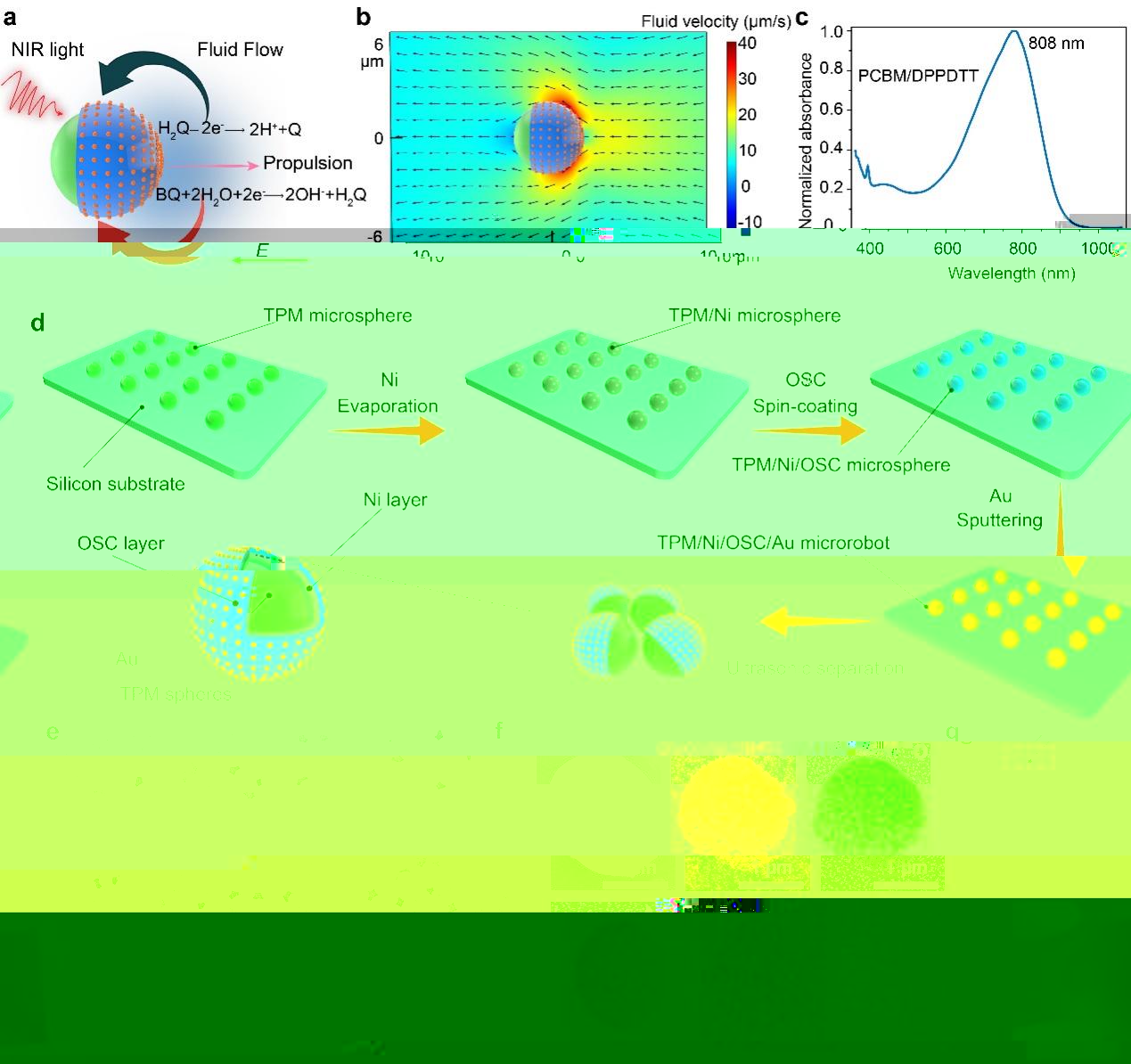該微納機器人的驅動機制主要依靠近紅外光驅動的光電化學反應所引發的自擴散泳動(self-diffusiophoresis)(圖2)。具體來說,塗層薄膜通過吸收NIR光,驅動光電化學反應,形成離子濃度梯度,從而推動微納機器人的運動。這種自擴散泳動機制使得微納機器人能夠在NIR光照下實現高效的定向運動。