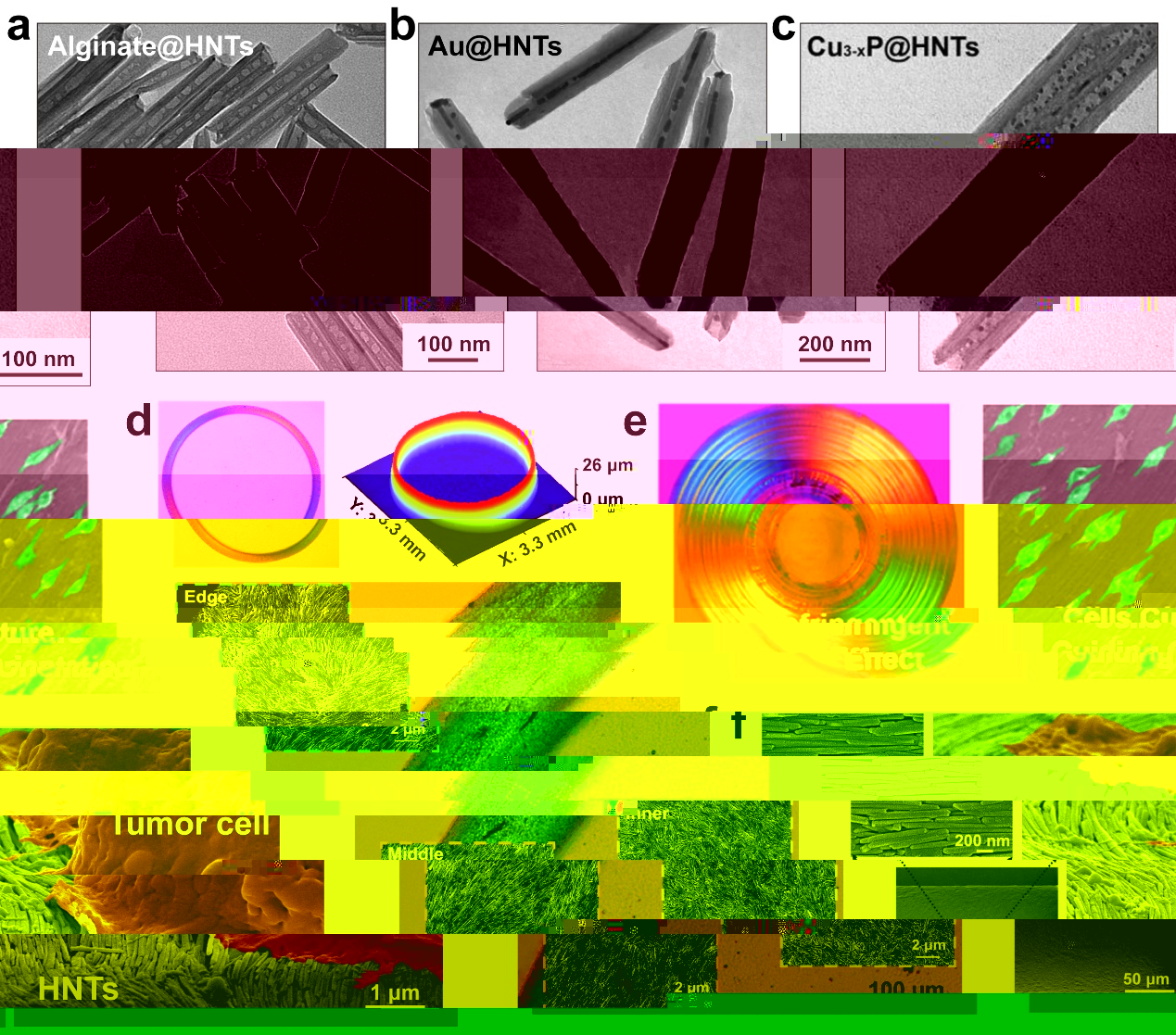 該論文從HNTs的起源、礦物開采純化和基礎表征出發,介紹了HNTs的中空管狀納米管結構,内外表面的異質性,表面積、孔隙和表面缺陷,親水性以及生物安全性。圍繞這些特征,讨論了其成分結構、理化性質與生物活性的關系。HNTs的中空管狀結構産生強大的毛細管效應,可通過毛細管吸力填充液體、離子和藥物分子(圖2)。此特性可用于在腔内限域合成納米粒子(例如CeO2、Au、Cu3-xP等)。還可加載藥物、蛋白質和核酸等用于保護、遞送和緩釋。高長徑比的棒狀結構可在不同條件引導下在界面排列成規則圖案,實現微納米自組裝。這些有序結構增強了細胞相互作用,引導它們定向粘附和生長,對于重建骨骼、神經和肌肉等組織具有重要意義。這種納米管的有序排列還使界面粗糙度與細胞僞足和各向異性适應性相匹配,顯著提高了循環腫瘤細胞的捕獲效率。